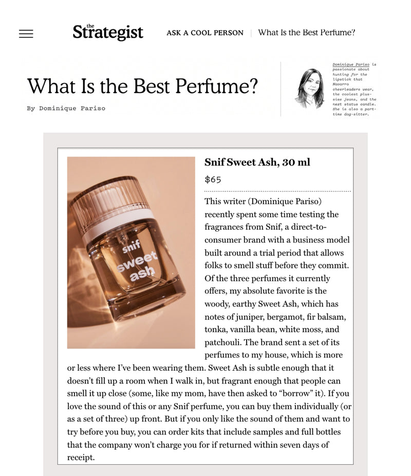 "Sweet Ash is subtle enough that it doesn’t fill up a room when I walk in, but fragrant enough that people can smell it up close (some, like my mom, have then asked to “borrow” it)."