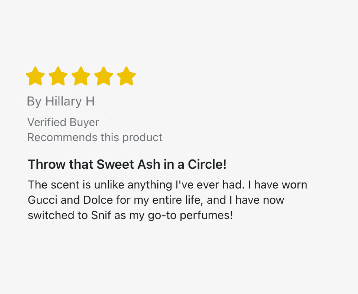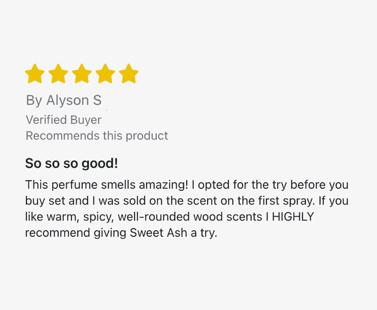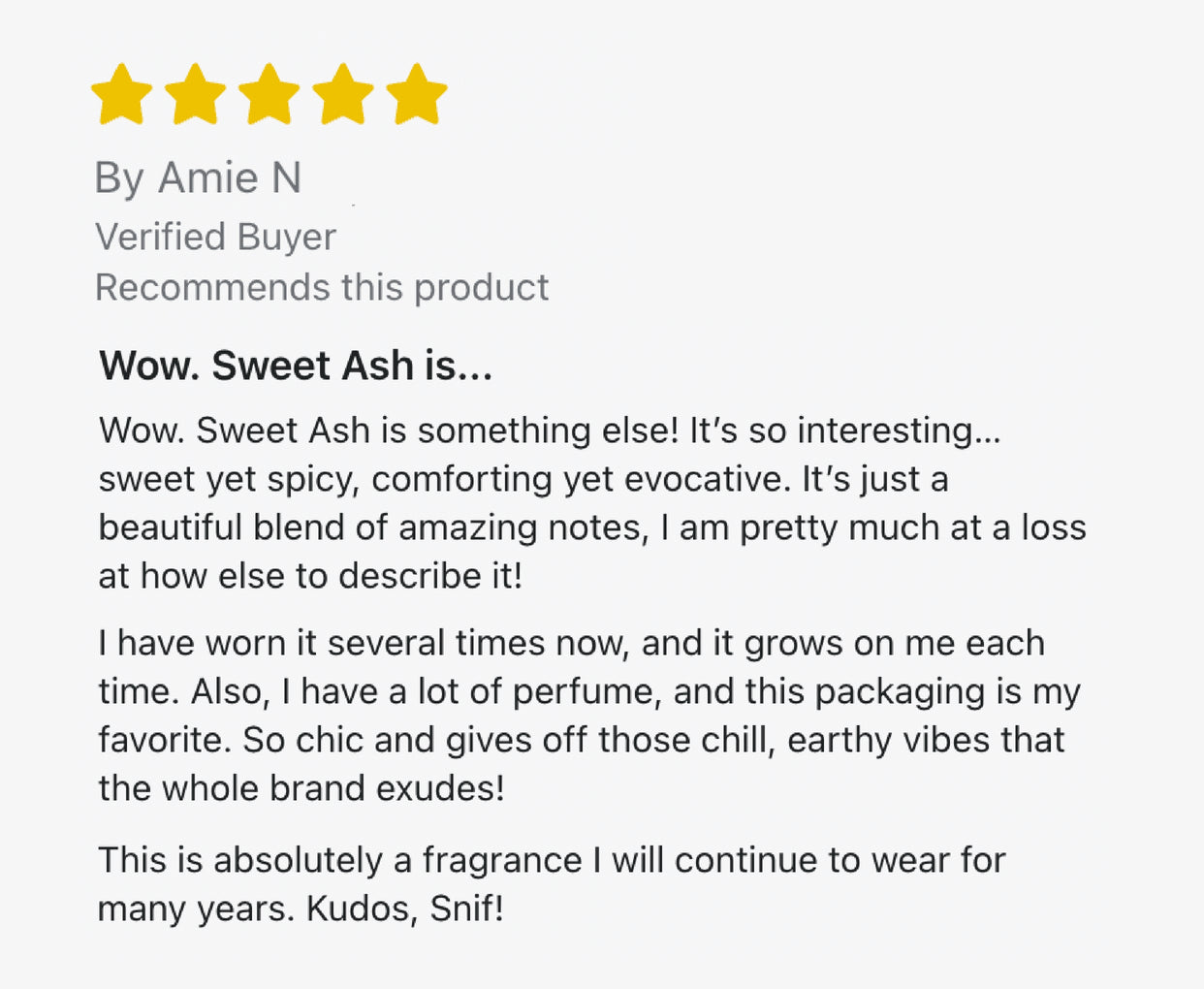“Sweet Ash embodied the sweetness of patchouli, vanilla bean, and white moss that I often search for when purchasing a new scent.”